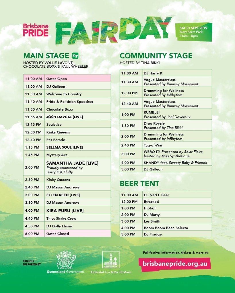 Check out the full lineup of amazing performers and get yourself down to New Farm Park next Saturday for what is sure to be a spectacular, vibrant and fun filled event celebrating love, unity and of course Pride.